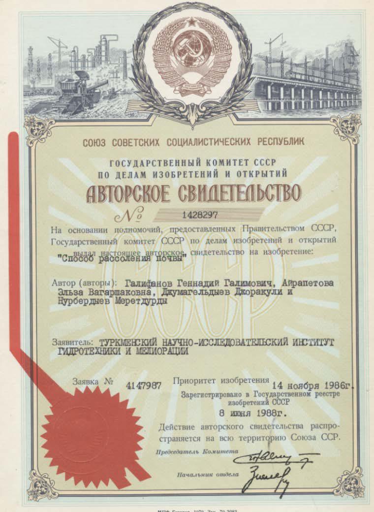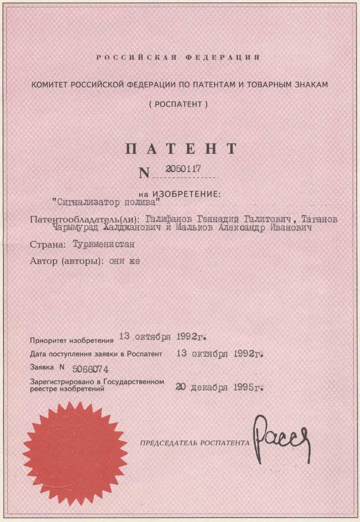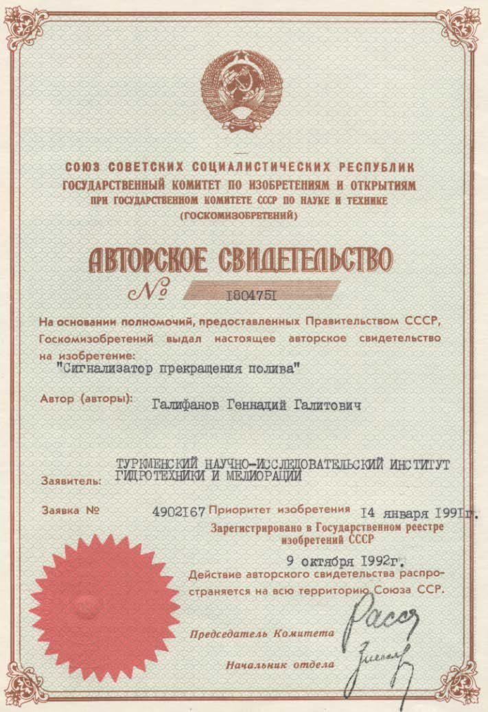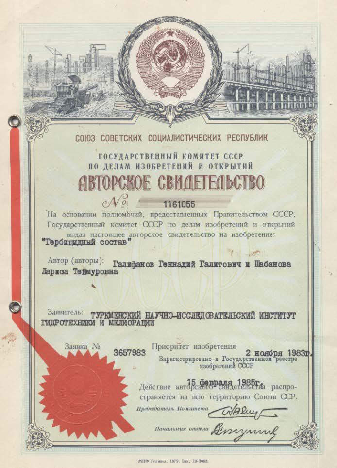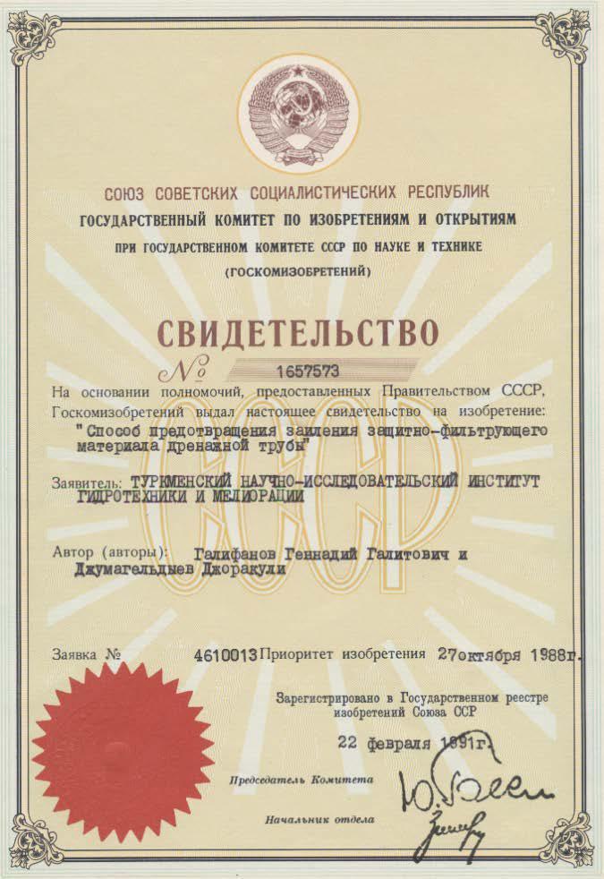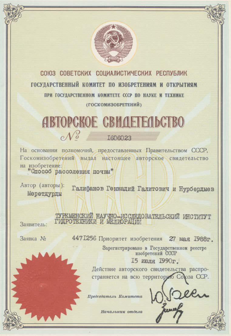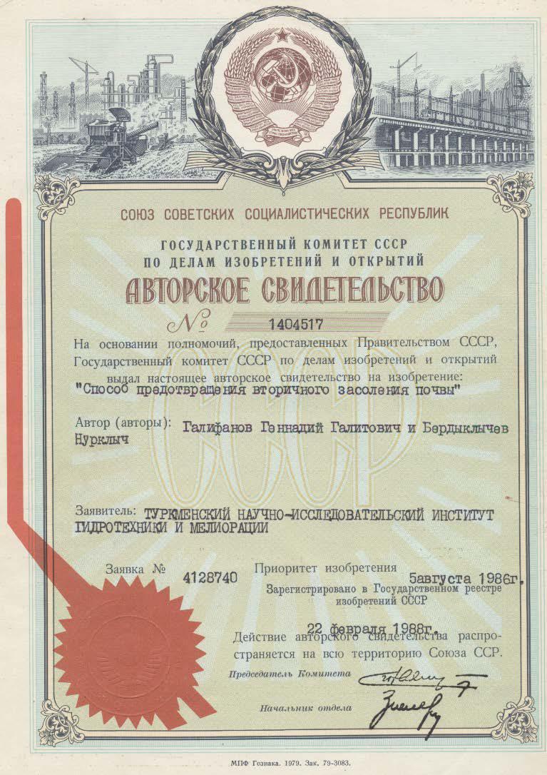 Кандидат сельскохозяйственных наук, заведующий лабораторией туркменского научно- исследовательского института гидротехники и мелиорации, старший научный сотрудник, изобретатель Галифанов Геннадий Галитович является автором более 200 научных статей в области сельского хозяйства, мелиорации земель, эксплуатации гидромелиоративных систем и охраны интеллектуальной собственности, в том числе книг «Охраноспособность товарных знаков» (2014), «Охраноспособность и охрана товарных знаков» (2018) «Проблемы изобретательства (1 том, 2023), а также пятидесяти одного изобретения, защищенных авторскими свидетельствами СССР и патентами Российской Федерации.