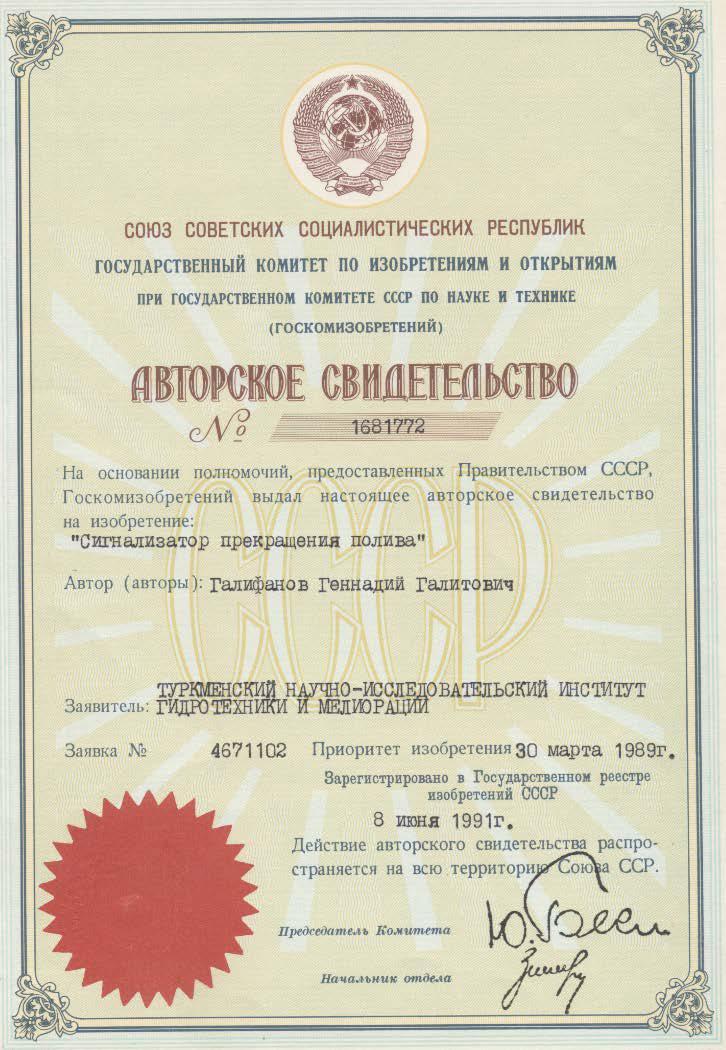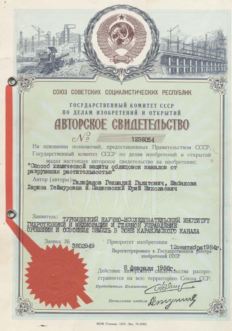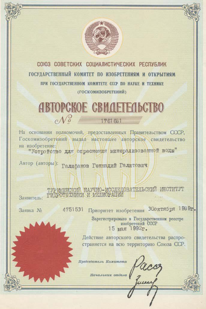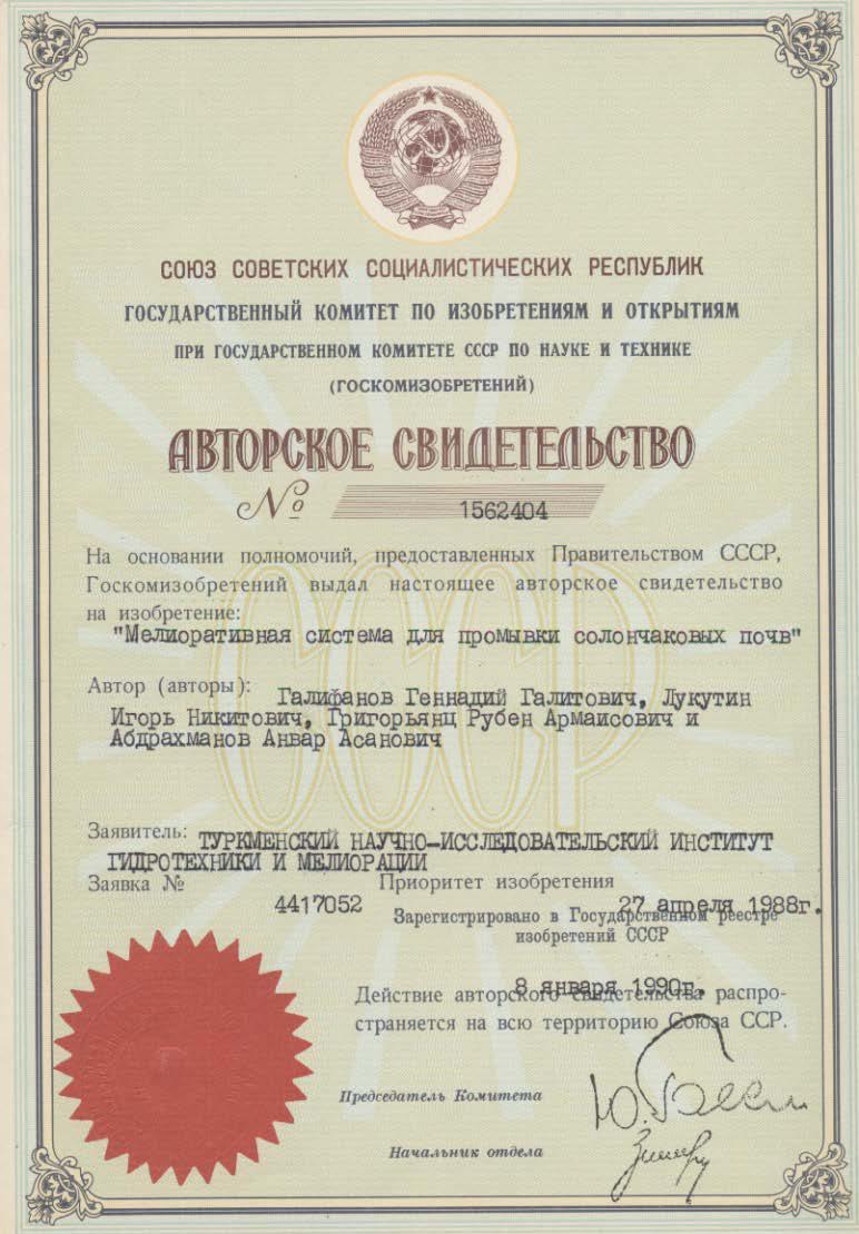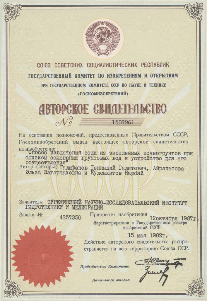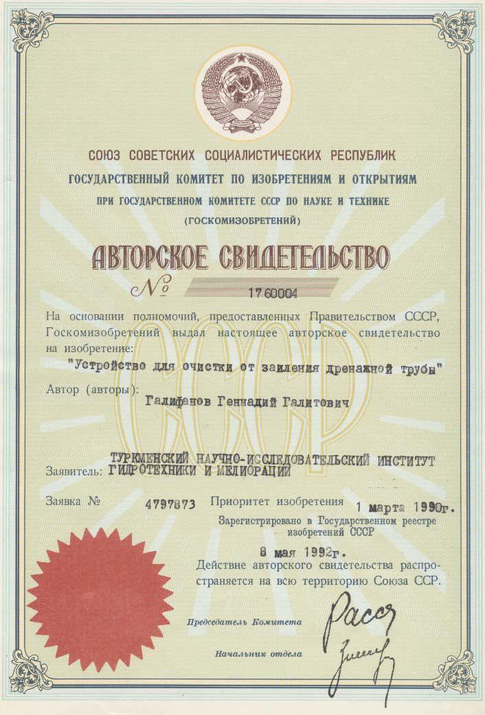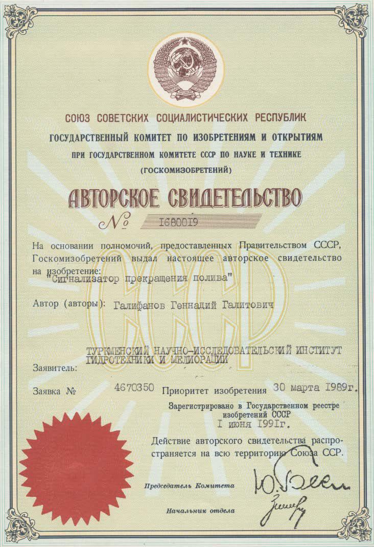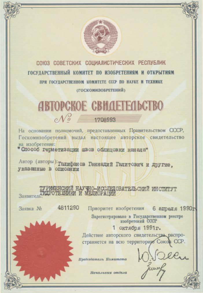 Кандидат сельскохозяйственных наук, заведующий лабораторией туркменского научно- исследовательского института гидротехники и мелиорации, старший научный сотрудник, изобретатель Галифанов Геннадий Галитович является автором более 200 научных статей в области сельского хозяйства, мелиорации земель, эксплуатации гидромелиоративных систем и охраны интеллектуальной собственности, в том числе книг «Охраноспособность товарных знаков» (2014), «Охраноспособность и охрана товарных знаков» (2018) «Проблемы изобретательства (1 том, 2023), а также пятидесяти одного изобретения, защищенных авторскими свидетельствами СССР и патентами Российской Федерации.