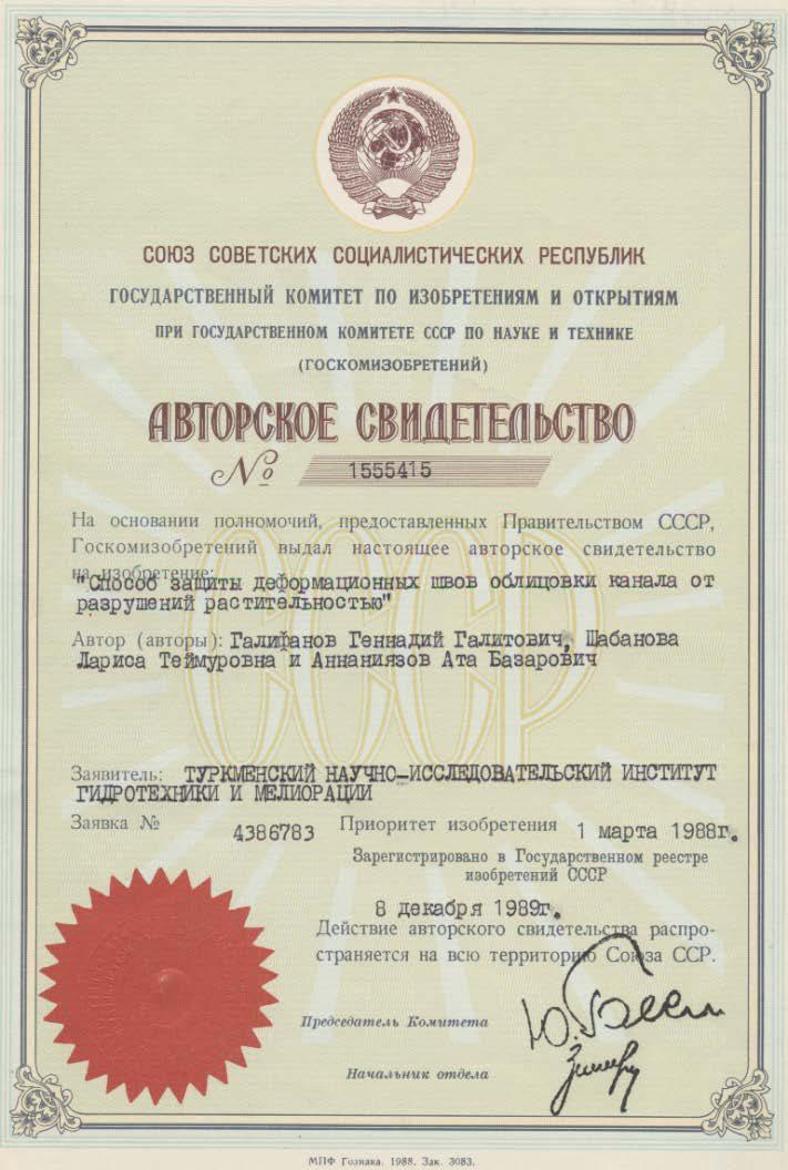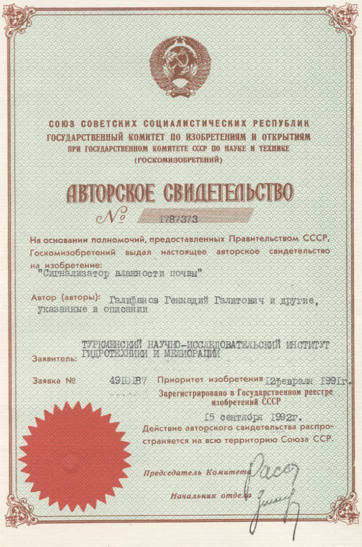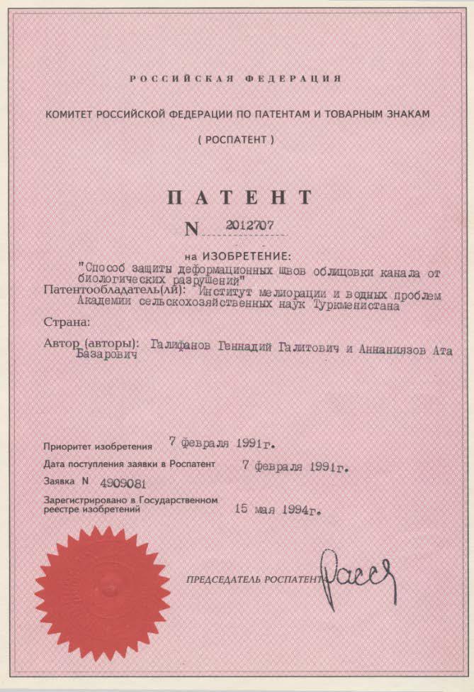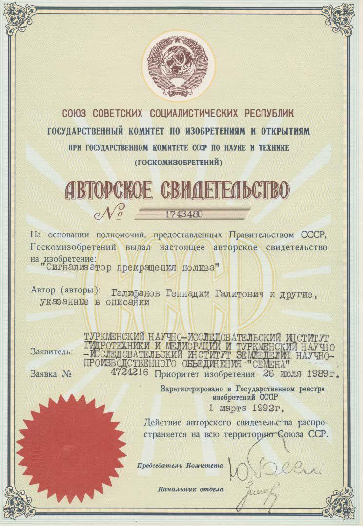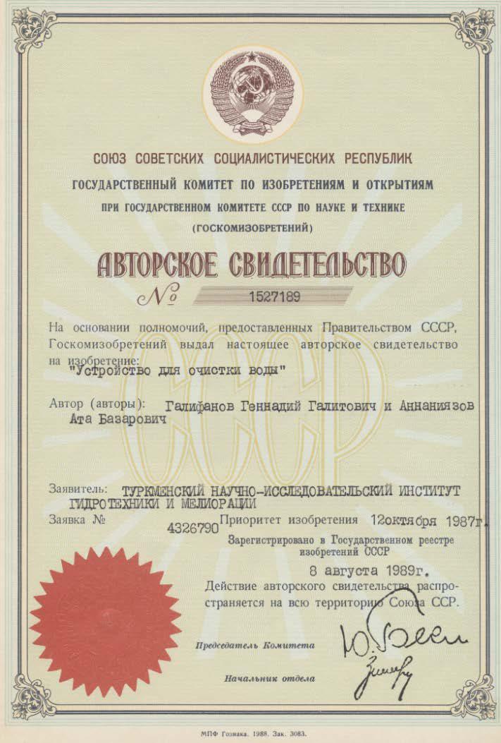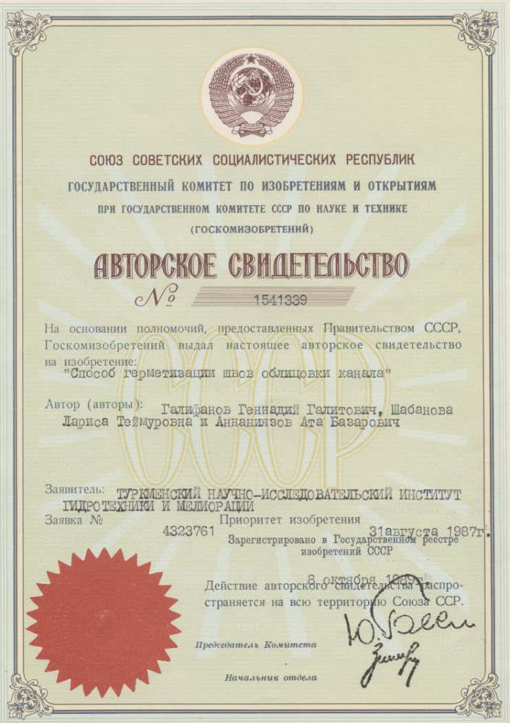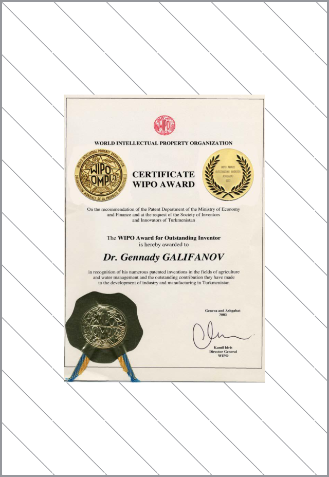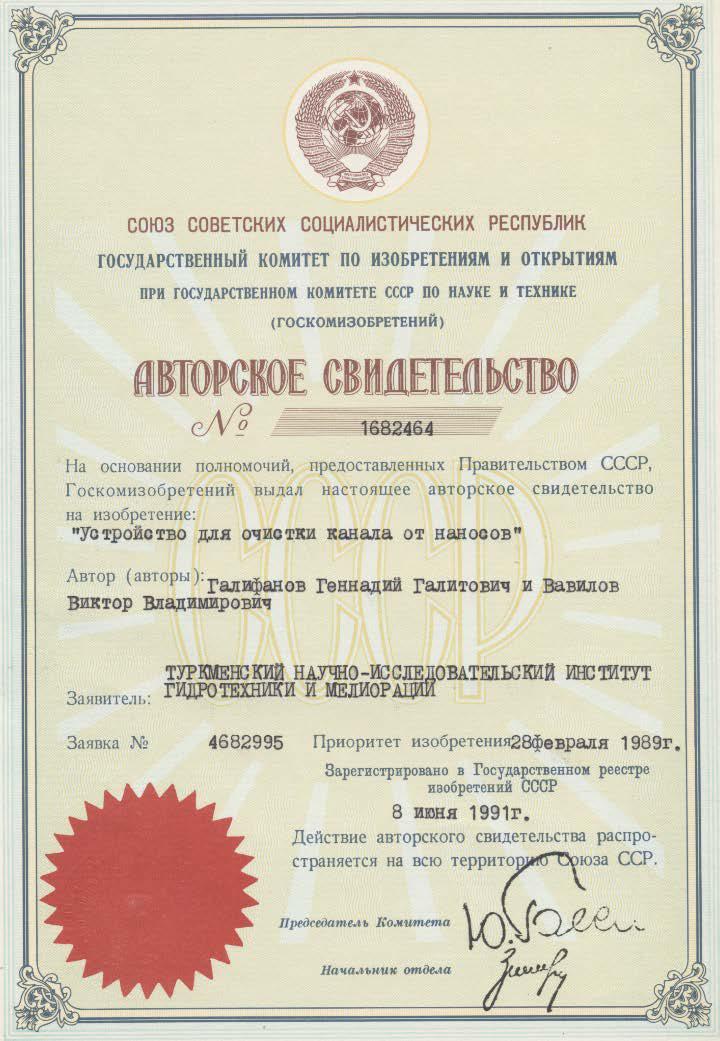 Кандидат сельскохозяйственных наук, заведующий лабораторией туркменского научно- исследовательского института гидротехники и мелиорации, старший научный сотрудник, изобретатель Галифанов Геннадий Галитович является автором более 200 научных статей в области сельского хозяйства, мелиорации земель, эксплуатации гидромелиоративных систем и охраны интеллектуальной собственности, в том числе книг «Охраноспособность товарных знаков» (2014), «Охраноспособность и охрана товарных знаков» (2018) «Проблемы изобретательства (1 том, 2023), а также пятидесяти одного изобретения, защищенных авторскими свидетельствами СССР и патентами Российской Федерации.