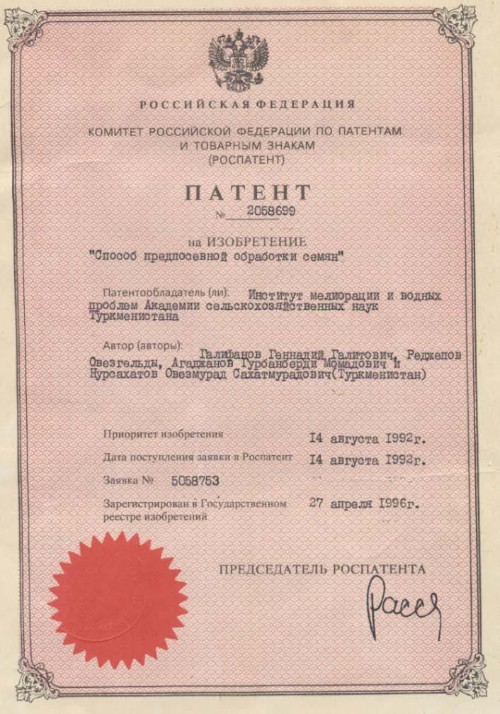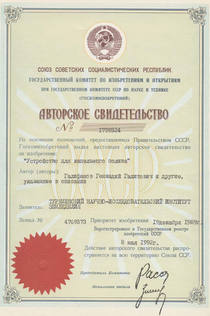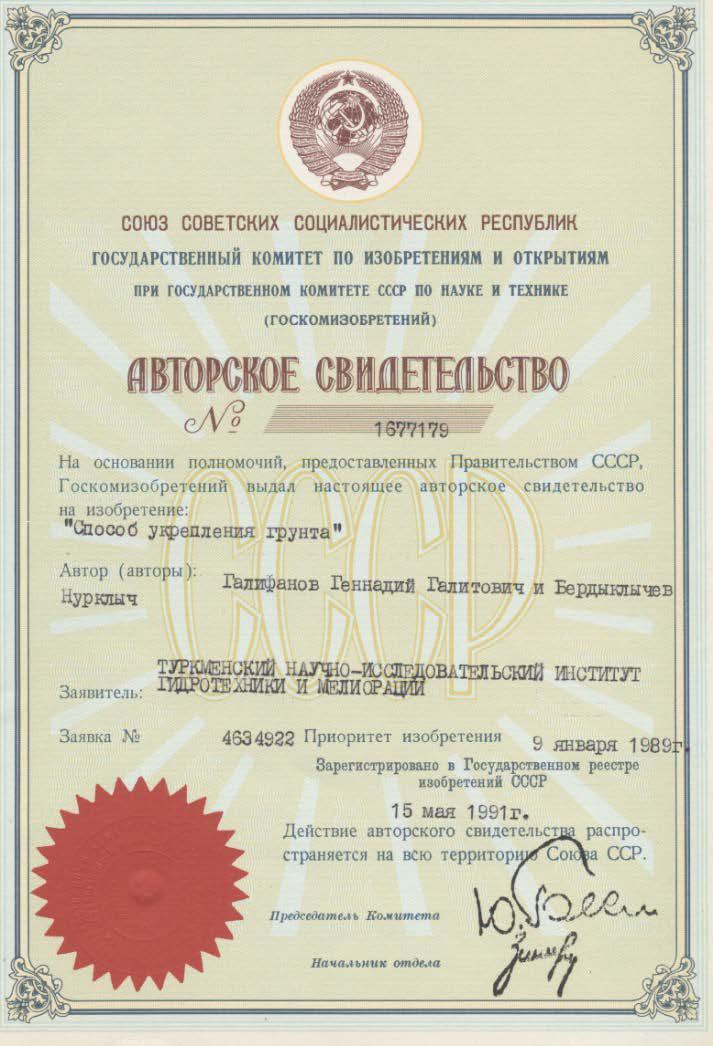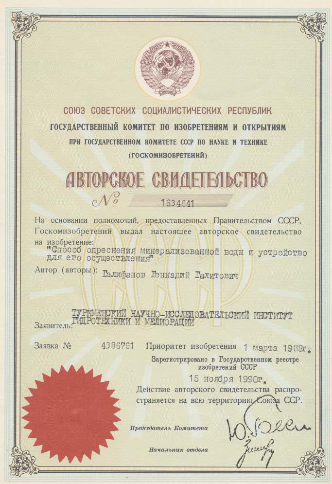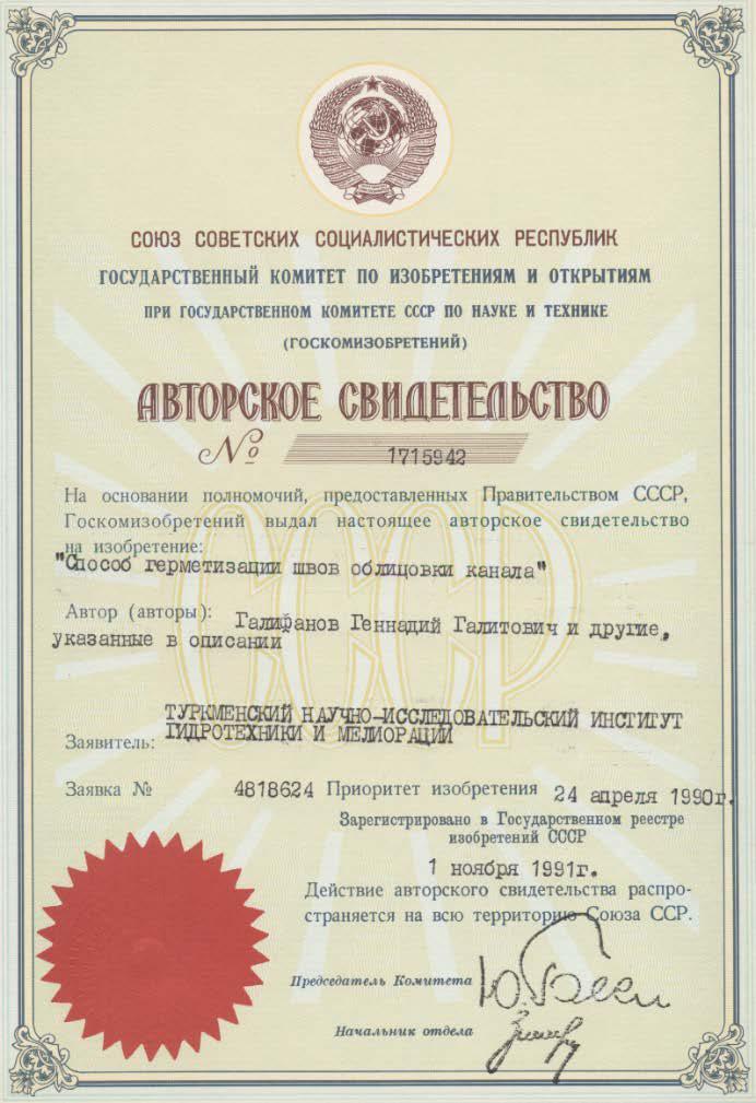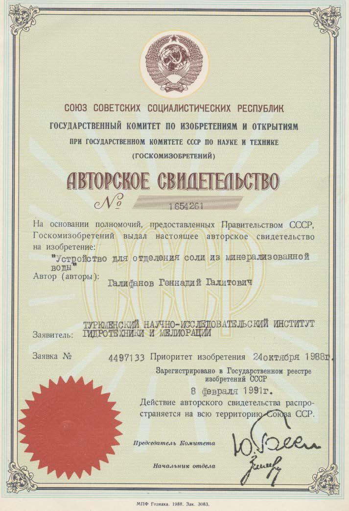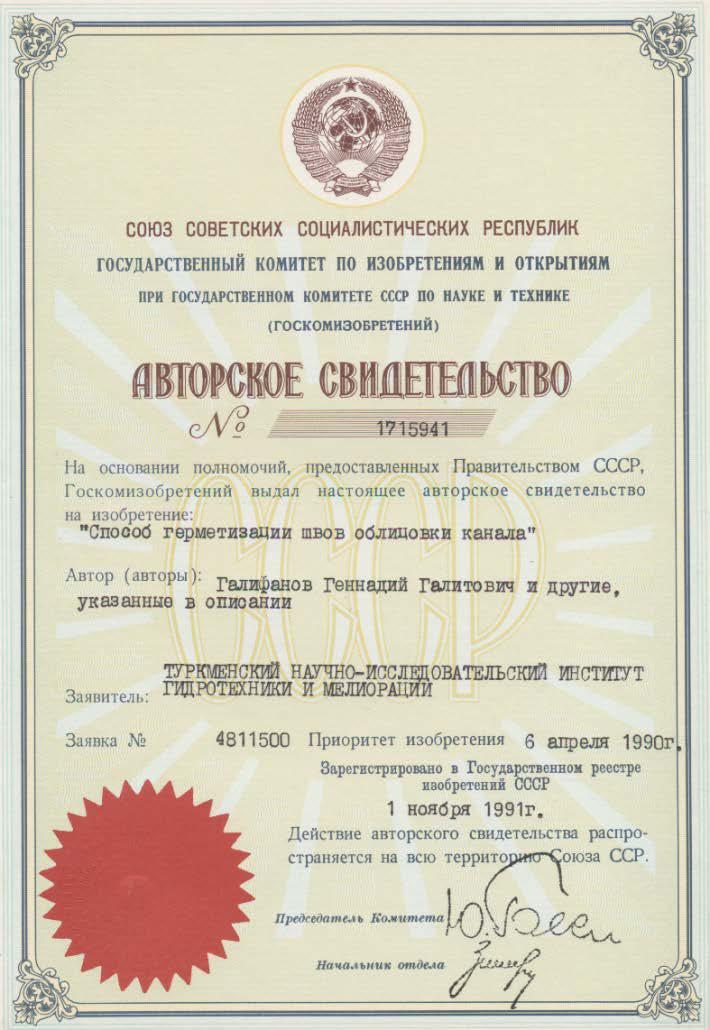 Кандидат сельскохозяйственных наук, заведующий лабораторией туркменского научно- исследовательского института гидротехники и мелиорации, старший научный сотрудник, изобретатель Галифанов Геннадий Галитович является автором более 200 научных статей в области сельского хозяйства, мелиорации земель, эксплуатации гидромелиоративных систем и охраны интеллектуальной собственности, в том числе книг «Охраноспособность товарных знаков» (2014), «Охраноспособность и охрана товарных знаков» (2018) «Проблемы изобретательства (1 том, 2023), а также пятидесяти одного изобретения, защищенных авторскими свидетельствами СССР и патентами Российской Федерации.