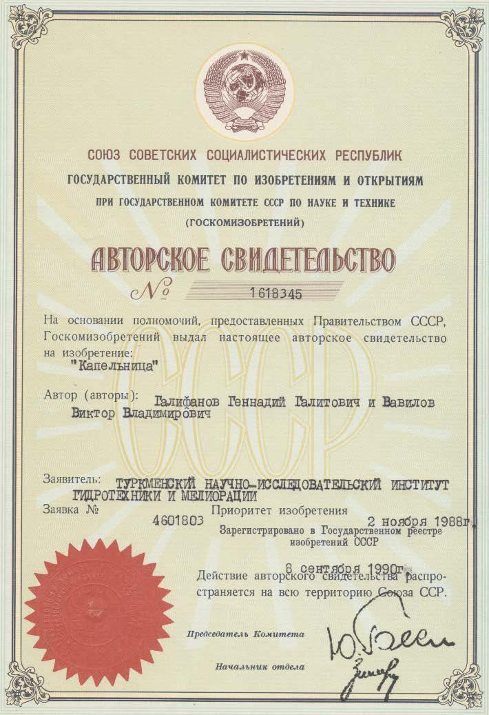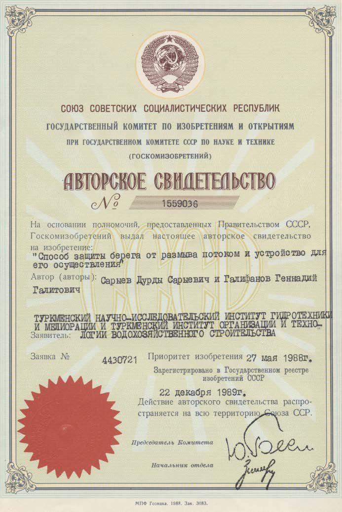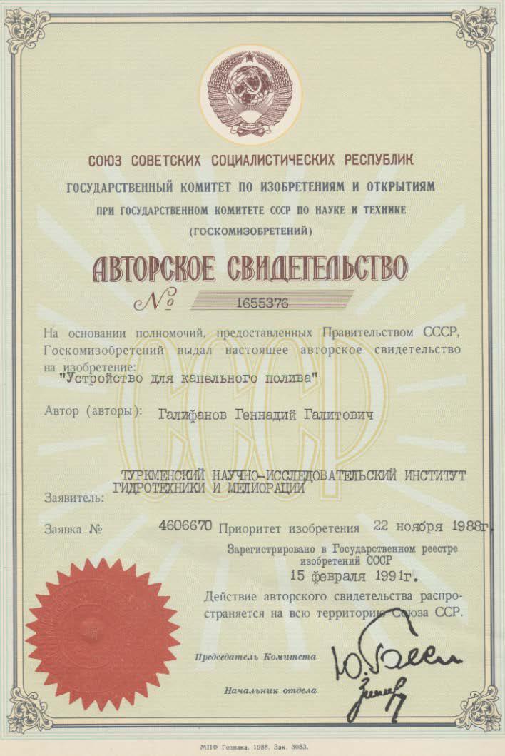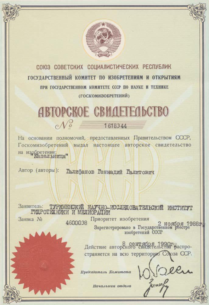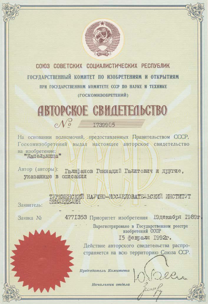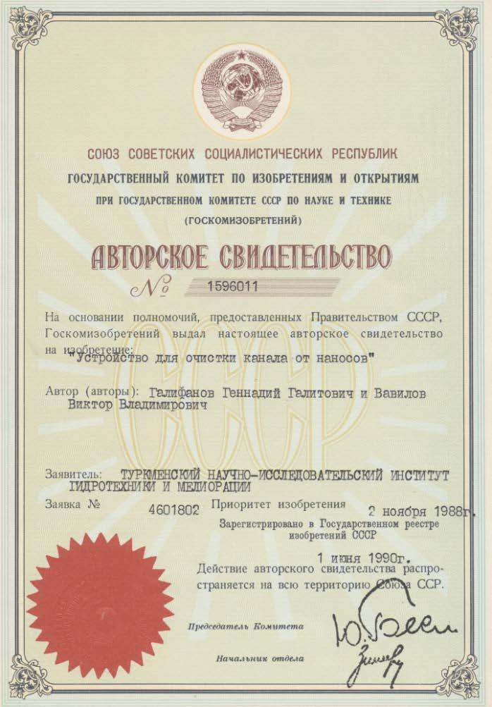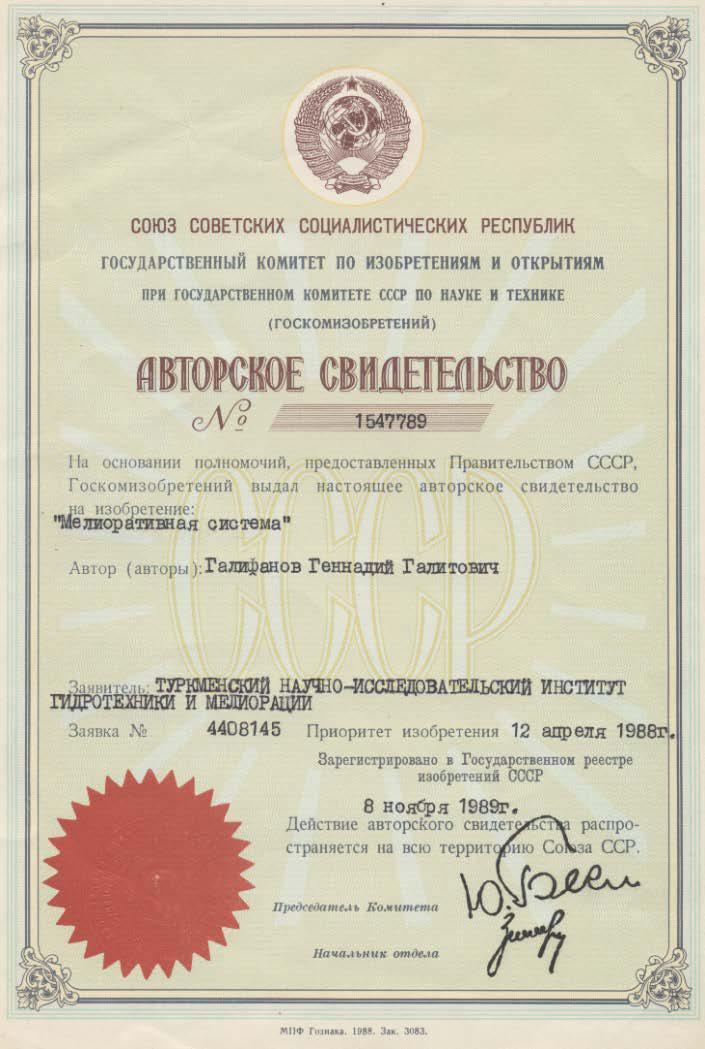 Отрадно, что один из соавторов Галифанова Г. Г., прекрасно исполнявший чертежи к изобретениям в период работы с Галифановым Г. Г. в туркменском НИИ гидротехники и мелиорации, был в сентябре 2022 года награжден руководством Евразийского патентного ведомства золотой медалью В. И. Блинникова «За вклад в изобретательское и патентное дело».
