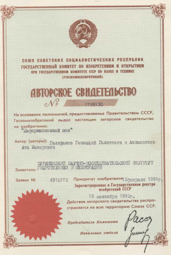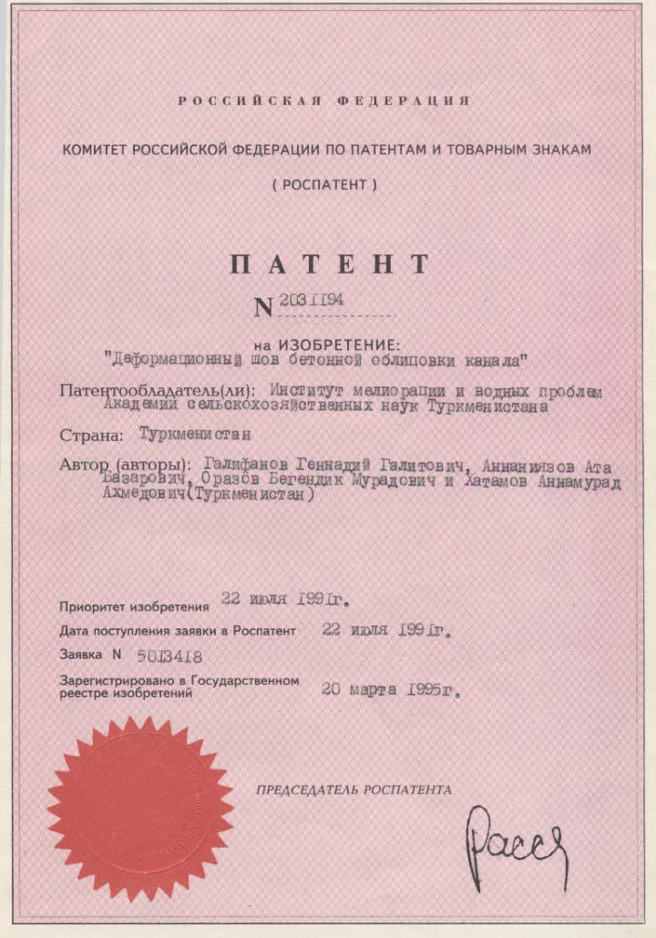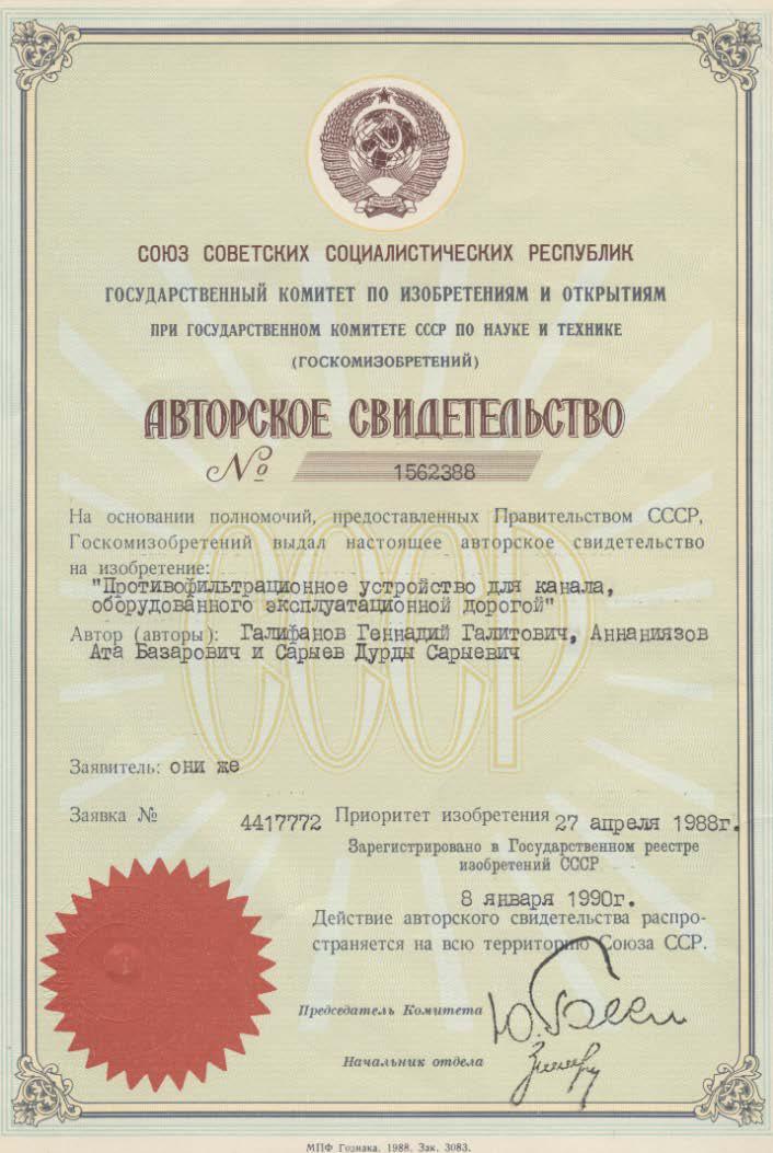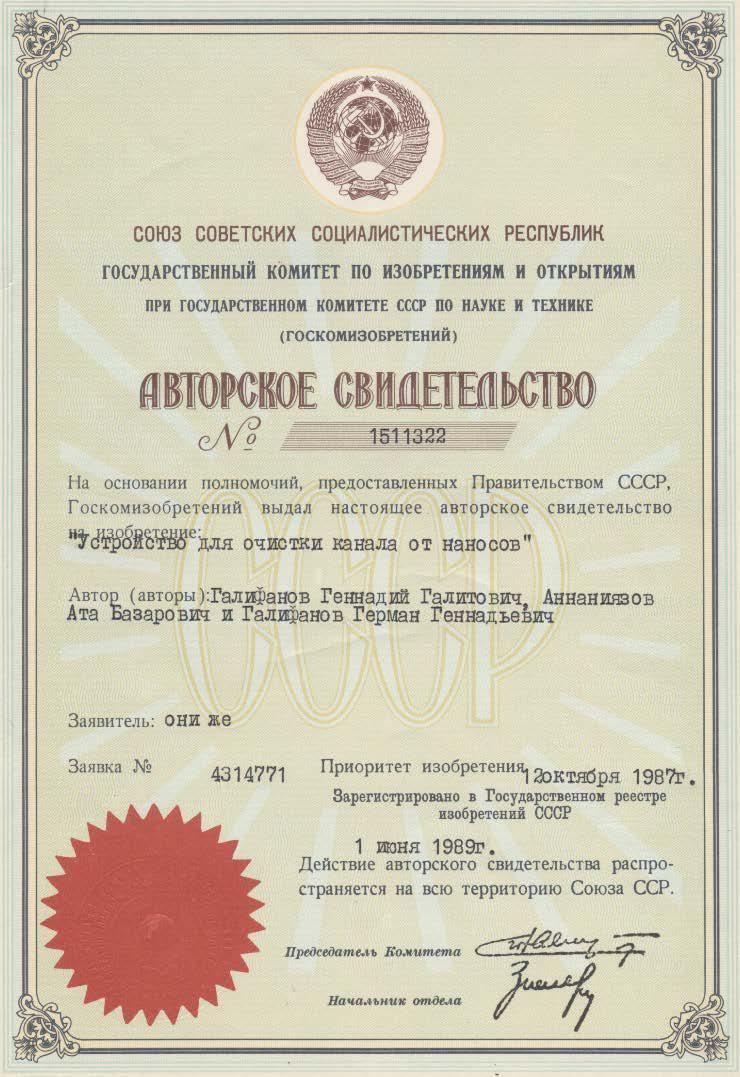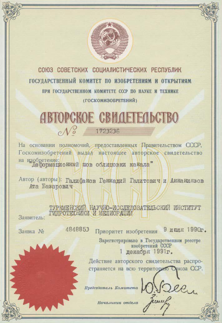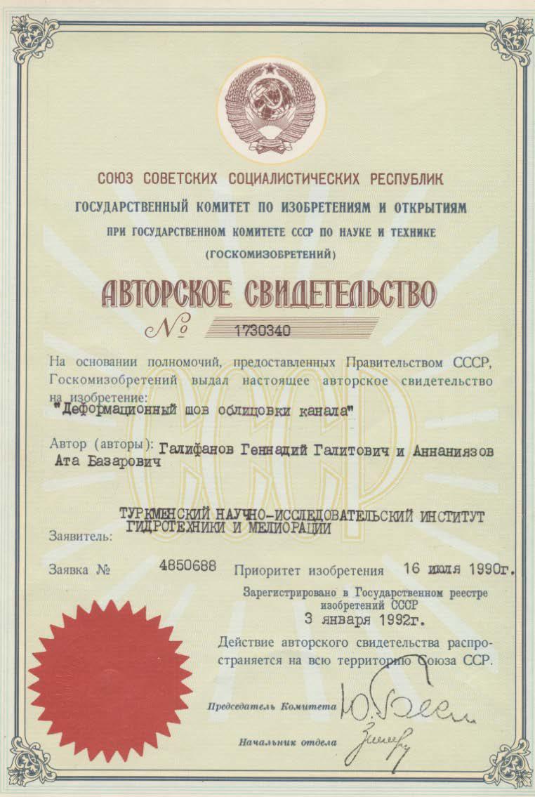 Отрадно, что один из соавторов Галифанова Г. Г., прекрасно исполнявший чертежи к изобретениям в период работы с Галифановым Г. Г. в туркменском НИИ гидротехники и мелиорации, был в сентябре 2022 года награжден руководством Евразийского патентного ведомства золотой медалью В. И. Блинникова «За вклад в изобретательское и патентное дело».